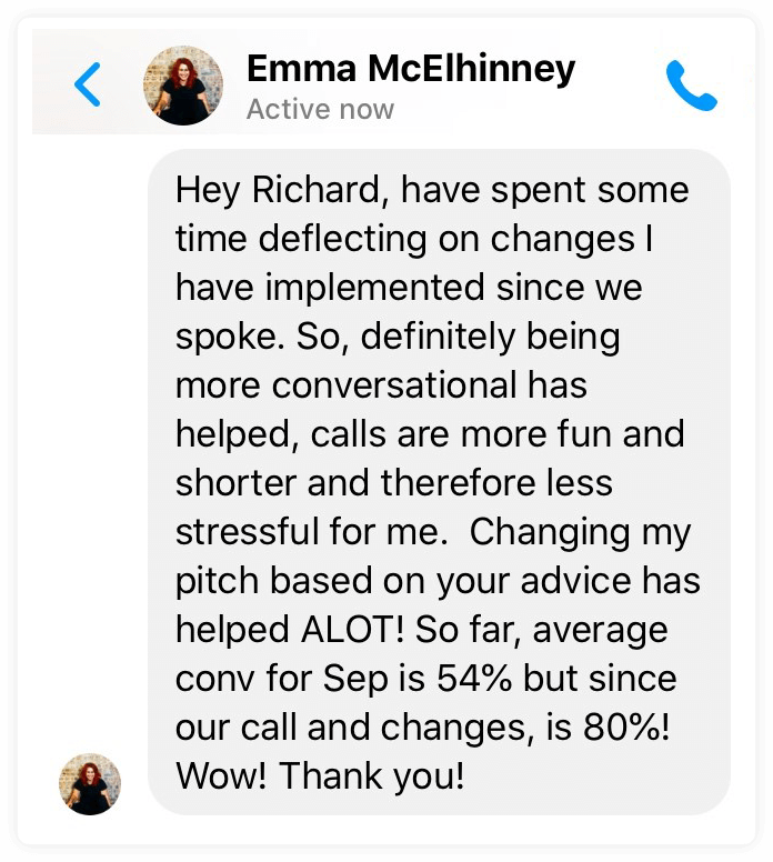 Using my method, she says people feel great on her call. The calls are quick, conversations flow easily and prospects are ‘drooling, ready to buy my services’ by the end.